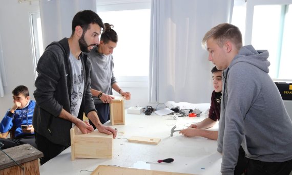 Los alumnos del Centro de Formación Profesional Santa Agatoclia de Mequinenza construyen cajas nido como parte de un taller medioambiental
